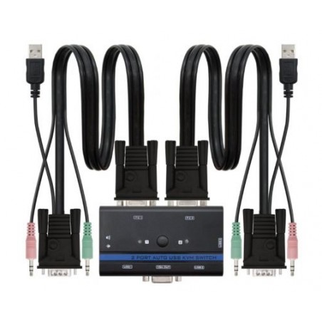 Este switch KVM é um dispositivo que pode controlar dois computadores com um único teclado, mouse, monitor e alto-falantes.